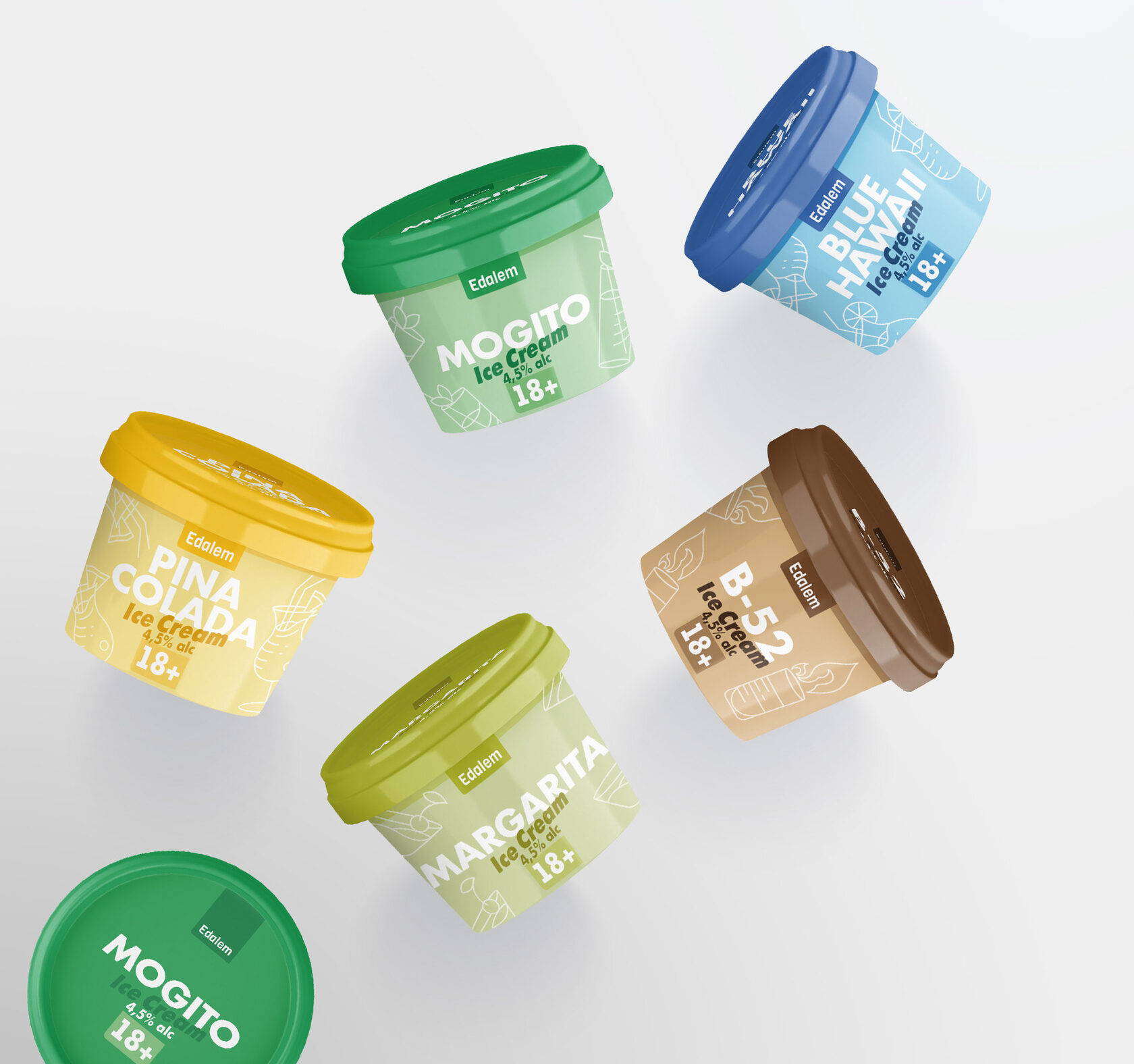 Треба було створити логотип та лінійку упаковок для алкогольного морозива, натхненого популярними коктейлями, такими як Pina Colada, B-52, Mochito та іншими.