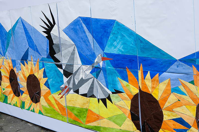 Наші Ілюстратори намалювали 5 картин у полігональному стилі на українську тематику. Потім ми зробили з них "велику розмальовку" у розмір людини - навіть більше).